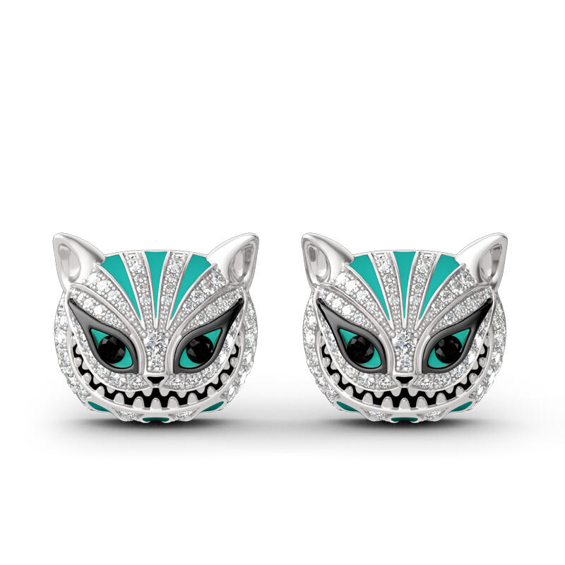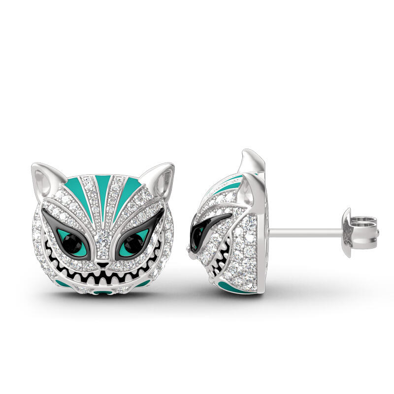 The Cheshire Cat is a fictional cat in Alice's Adventures in Wonderland and known for its ability to appear and disappear at will and for its distinctive mischievous grin. Beautifully handcrafted in sterling silver, each earring features a Cheshire Cat with a cute round head. It shimmers with sparkling stones, bright eyes and prominent teeth.You can`t feed a real Cheshire Cat but you can have this pair of earrings.