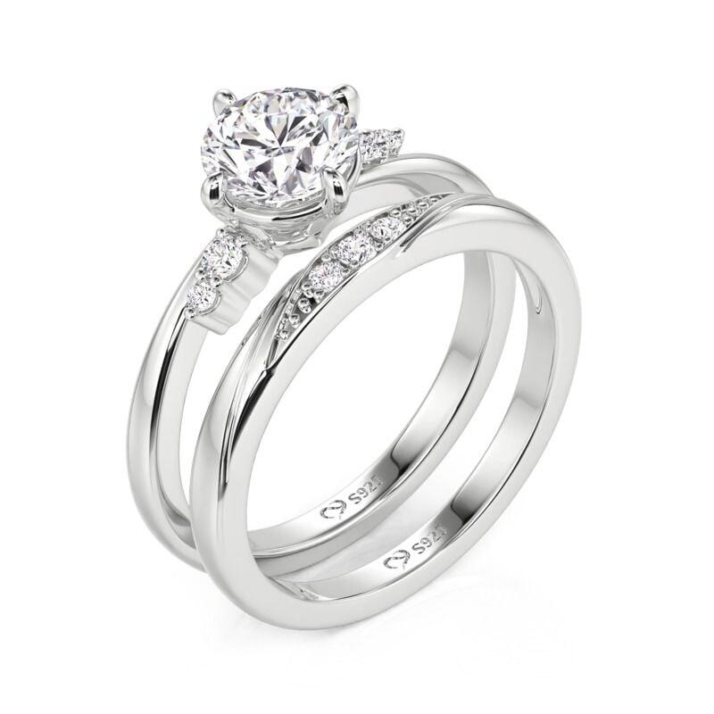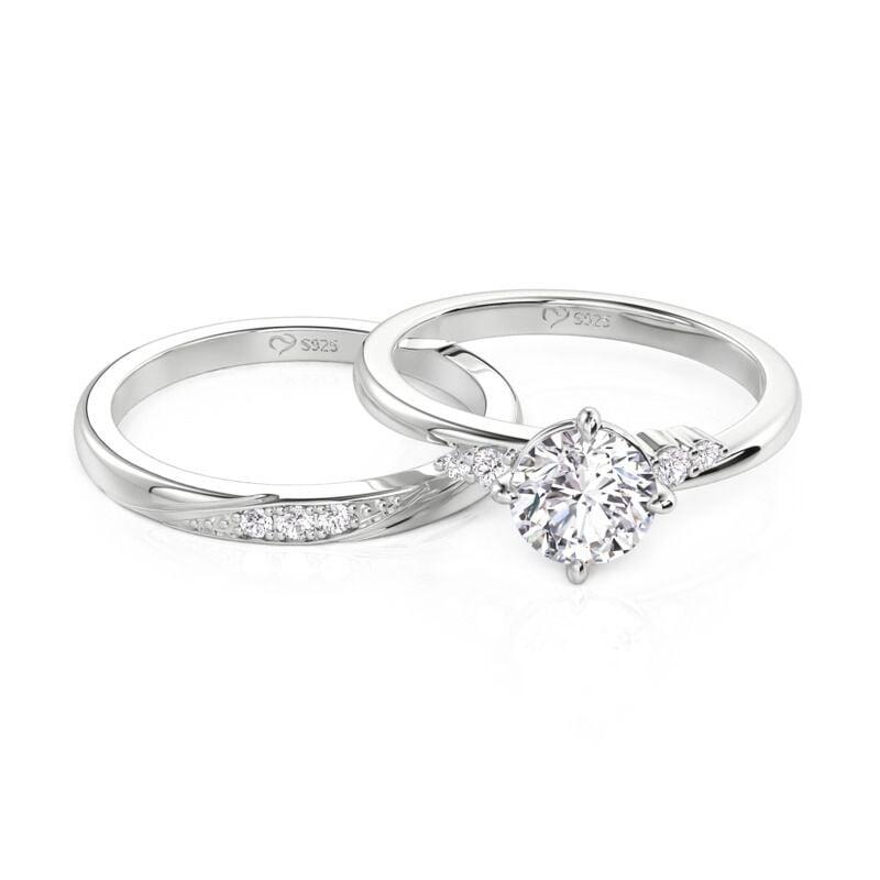 This Jeulia Bypass Engagement Ring Set is meticulously crafted from 925 sterling silver, embodying the wholeness of love and the beauty of negative space through its exquisite symmetrical design. The center ring features a round-cut main stone, its brilliant fire gently embraced by flanking accent stones arranged in a bypass symmetrical pattern, creating a visual rhythm of light trails. The secondary ring echoes the main ring's symmetrical lines, retaining the accent stone design on both sides. When worn together, the main stone's brilliance and the secondary ring's void create a dynamic interplay of light and shadow, symbolizing love's perfection and the space reserved for mutual protection. Worn separately, the main ring embodies timeless elegance, while the secondary ring's unique asymmetrical design makes it a distinctive choice for everyday styling. Each wearing tells an endless chapter of love's story.