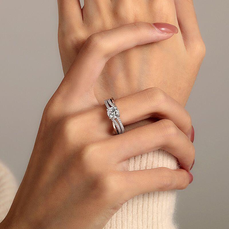 This Jeulia Double Twist Round Cut Engagement Ring reimagines the visual depth of a classic solitaire ring with its innovative double-band design. The central round brilliant-cut diamond radiates brilliant fire and sparkle, cradled by a sleek setting. Dual bands wrap around the finger like parallel ribbons, while pave-set stones cascade in a gradient pattern like a starry sky. This design extends the brand's signature twisted motif, creating a dual aesthetic of “radiant brilliance and fluid movement.” The design preserves the solemn ceremonial essence of an engagement ring while adding a three-dimensional, voluminous visual effect through its double-band structure. Whether symbolizing a profound promise in a momentous occasion or serving as a daily companion through the passage of time, this classic twist ring narrates enduring affection through the interplay of light and shadow.