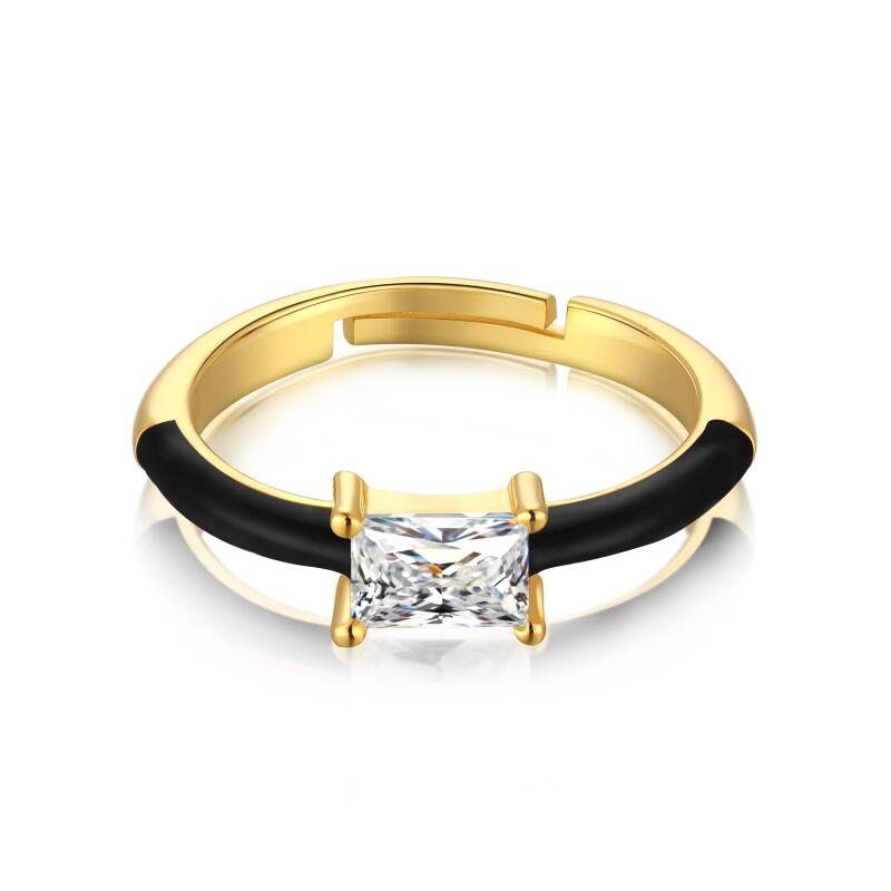 This sterling silver open ring with an emerald cut center stone. The emerald-cut center stone is the ring's most striking feature. Set horizontally on the ring arm, it exudes a subtle yet powerful elegance. The half-circle ring arm, decorated with black enamel, adds an intriguing contrast to the overall look. The enamel also provides a tactile contrast, adding a layer of interest and complexity to the ring's feel. The open design of the ring allows it to be adjusted to fit different finger sizes, making it a versatile and practical choice.