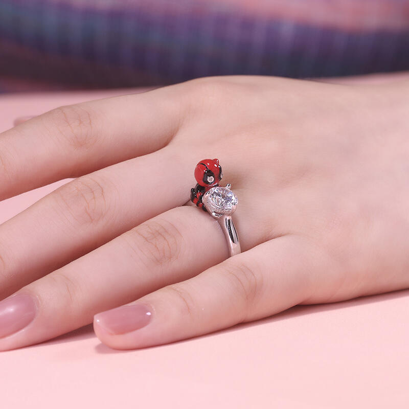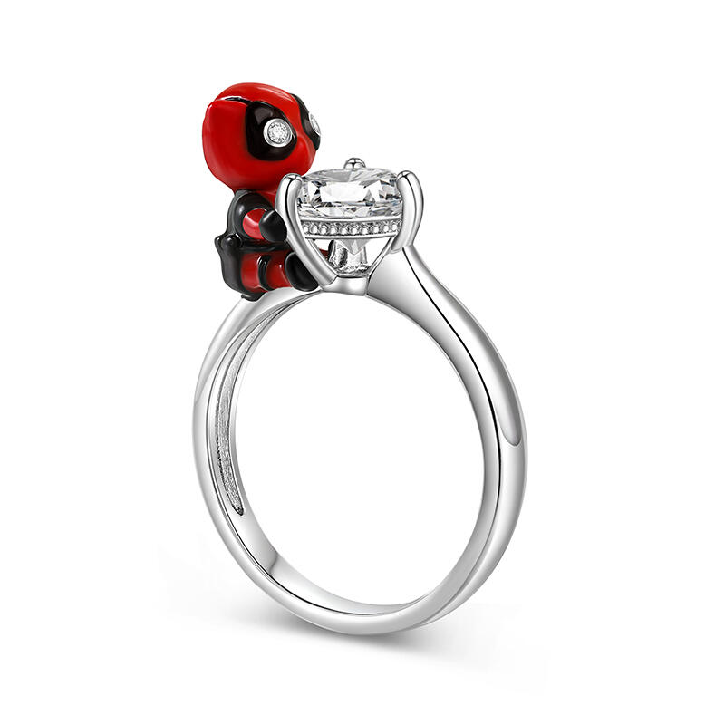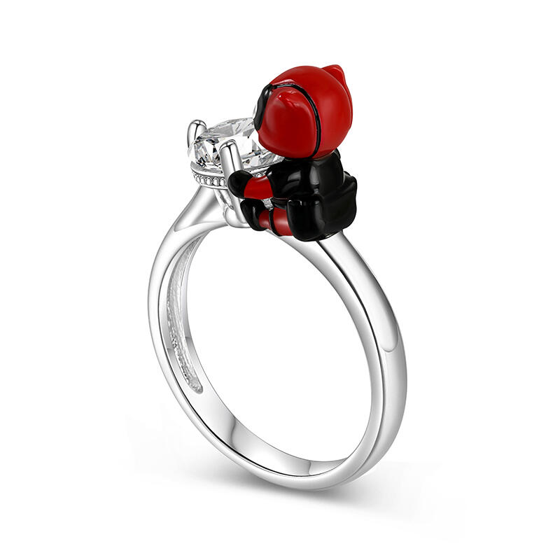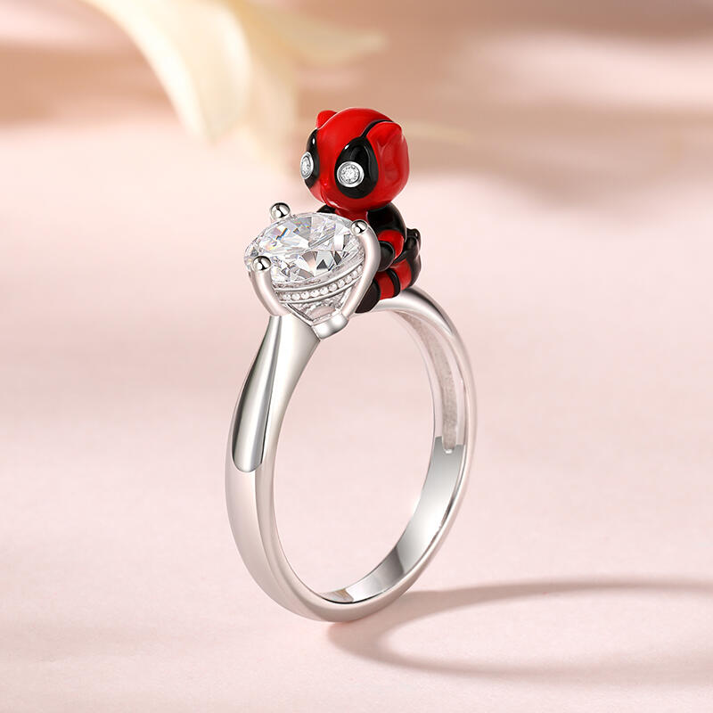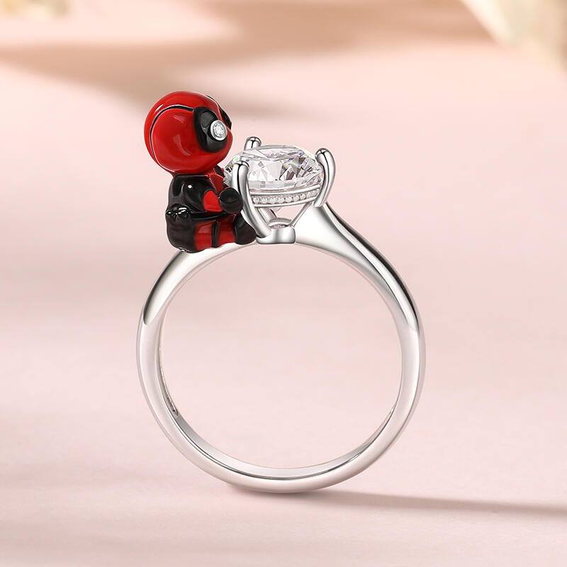 This antihero is a character in the comic book universe. He has the ability to heal himself and is known for his unique sense of humor and self-deprecation. He has a unique style and is unconventional, often solving problems in unexpected ways. Crafted in sterling silver, this antihero anime ring shows a white round-cut stone hugged by a cartoon antihero. You will find more adorable and creative designs in our Hug Me® anime rings collection.
