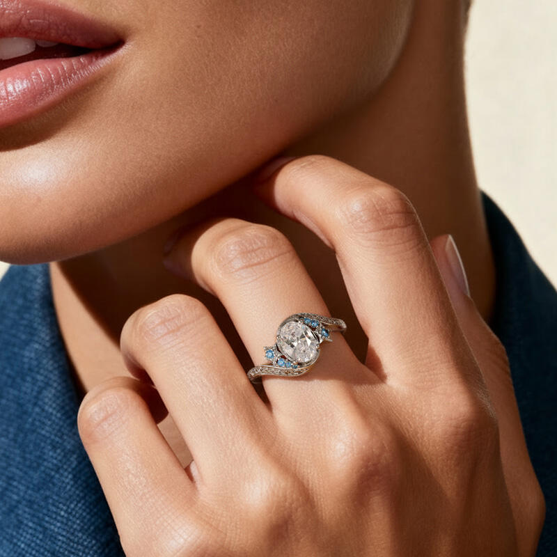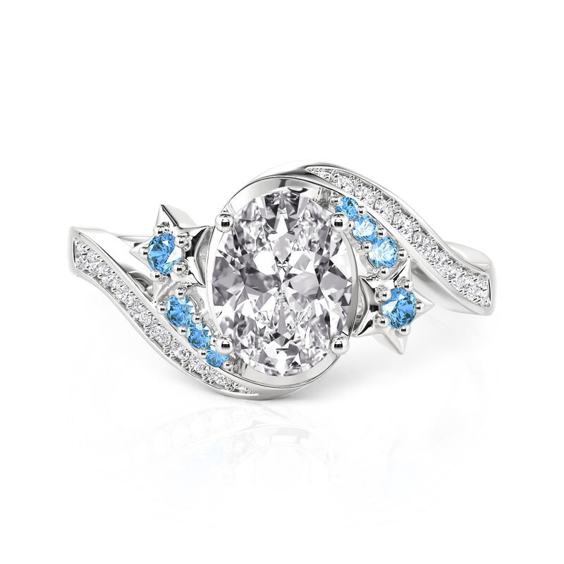 The Jeulia Luna Astra Star Bypass Oval Cut Ring showcases a celestial-inspired design that beautifully combines elegance and whimsy. The oval-cut center stone is flanked by sparkling accents, including star motifs and vibrant colored stones, reminiscent of a starry night sky. The bypass style adds a unique twist, symbolizing the intertwining paths of two lovers. This celestial ring is perfect for those looking to express their individuality and romantic spirit through a one-of-a-kind piece. Its blend of shimmering details and captivating design makes this bypass ring a striking choice for any occasion.