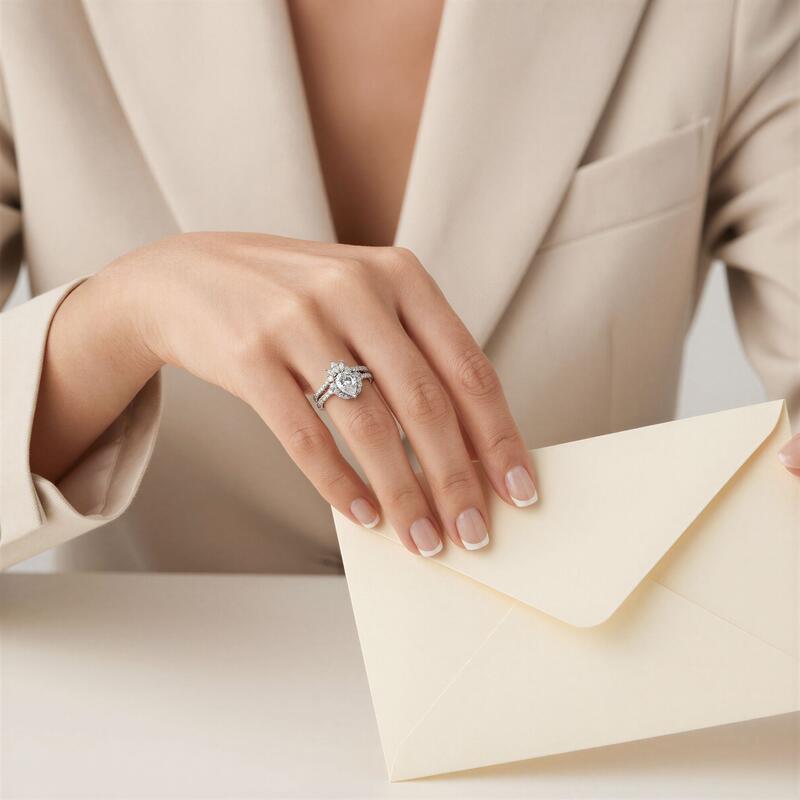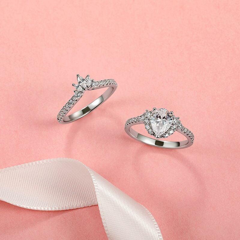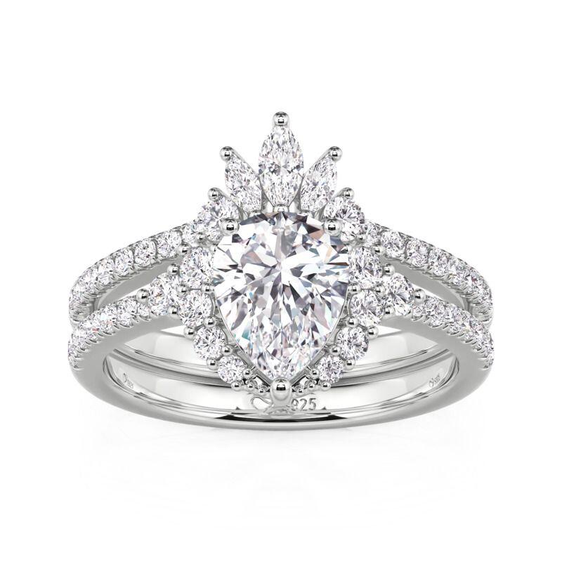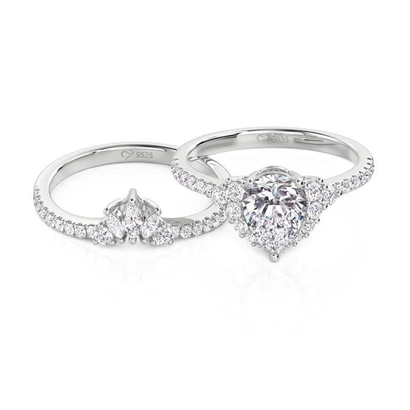 This Jeulia Minimalist Cluster Bridal Set is meticulously crafted from sterling silver, seamlessly blending the elegance of a pear-shaped center stone with the dazzling brilliance of multiple cluster settings to create a timeless symbol of love. The centerpiece features a 1-carat pear-shaped cut stone. Its elongated teardrop silhouette is accentuated by surrounding round diamonds, while the half-eternity band allows light to flow naturally from the fingertips. This affordable bridal set also includes a V-shaped band adorned with meticulously arranged marquise-cut diamonds. This piece complements the sparkling half-eternity bands on either side, creating a layered interplay of light and shadow when stacked with the main ring. This enhances the overall design with a rich, dimensional effect. This engagement and wedding ring set can be worn together to radiate magnificent brilliance at weddings and other significant occasions, or separated for individual wear to reveal understated elegance in daily life. Every glance captures the romance and promise of being enveloped in light.