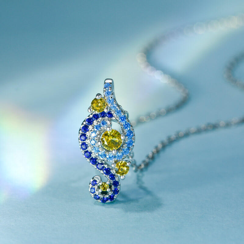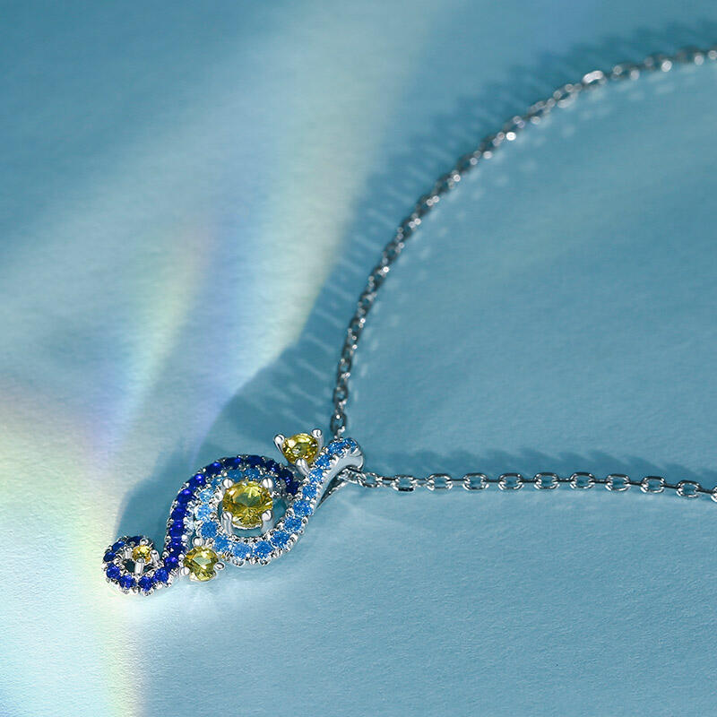 In a stunning display of style and craftsmanship, this necklace is brought to you. A combination of light blue, midnight blue, and yellow gold stones, the necklace is a premium miniature version of Van Gogh's timeless Starry Night painting. This piece of work reminds us to trust our dreams and not believe the critics of the world. "There is always hope, even in the darkest of times." So trust your dream and let this alluring jewelry make a statement.